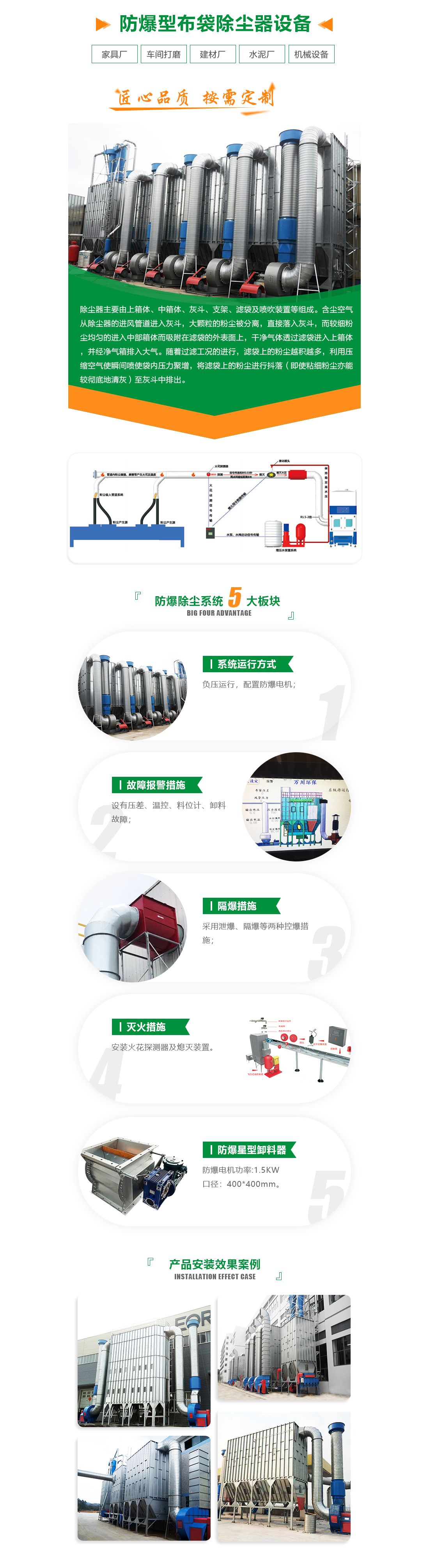 簡介:防爆布袋除塵器采用全新防燃、防爆結構設計,外加齊全的安全監測與消防措施,如除塵器箱體增加了泄爆片、除塵器頂部安裝消費噴淋管、溫控模塊、壓差模塊等.。消除了收塵器內部燃燒、爆炸的隱患,確保了除塵器長期穩定、高效地運行。