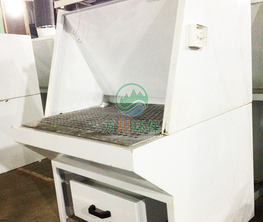 粉塵通過風(fēng)機產(chǎn)生的負(fù)壓經(jīng)打磨臺正面下側(cè)吸風(fēng)口進入打磨臺,大顆粒粉塵與內(nèi)板碰撞后,受重力的作用下落入集灰抽屜,細(xì)小顆粒的粉塵沿風(fēng)口上升到集塵管道,最后進入粉塵處理設(shè)備,經(jīng)有效處理后高空排放。